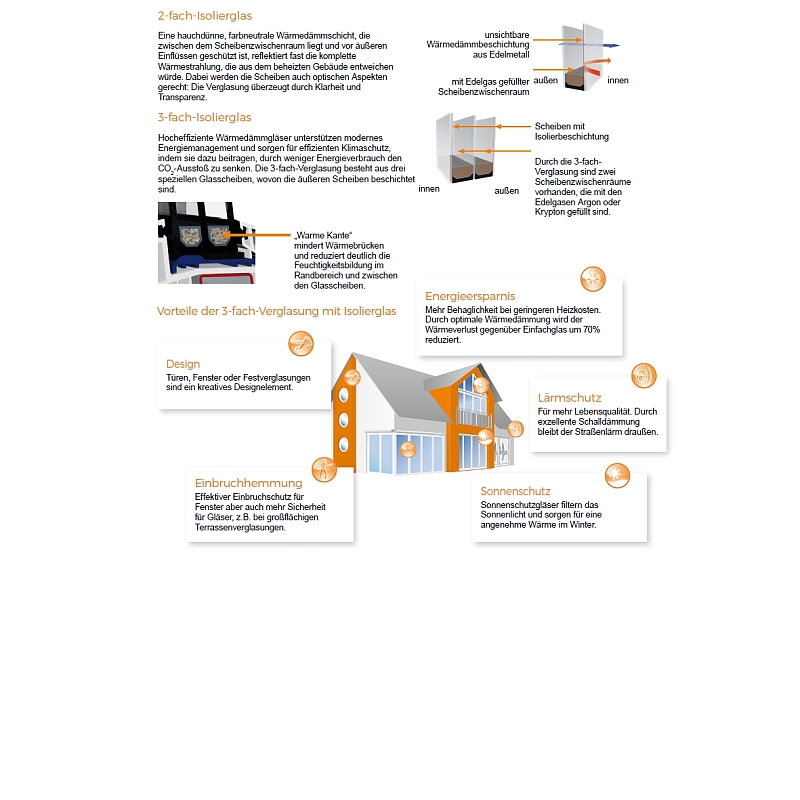 Sie wollen nicht auf erstklassige Isoliergläser verzichten? Unsere hochwertigen Gläser stellen einen wichtigen Bestandteil des modernen Fensters dar. Sie halten Wärme im Raum und Kälte draußen - aber auch umgekehrt. Eine gute Wärmedämmung wird durch beschichtete Glasoberflächen und mit edelgasbefüllten Glaszwischenräumen erzielt. Auch der Abstandhalter ("Warme Kante") für Isolierglas muss hohe Anforderungen erfüllen. Bei großen Temperaturunterschieden hält er den Wärmefluss zwischen Innen- und Außenscheibe gering.