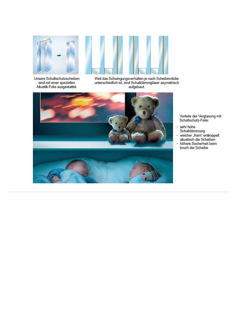 Die Schalldämmung der dicken, schweren Gläser kann zusätzlich gesteigert werden, wenn eine Einzelscheibe in zwei halb so dicke Scheiben unterteilt wird, die durch eine besondere Folie miteinander verbunden werden. Die Außen- oder Innenscheibe besteht dann also nicht nur aus einer einzelnen Scheibe, sondern aus einem Verbund von zwei dünnen Scheiben mit dazwischenliegender Folie.